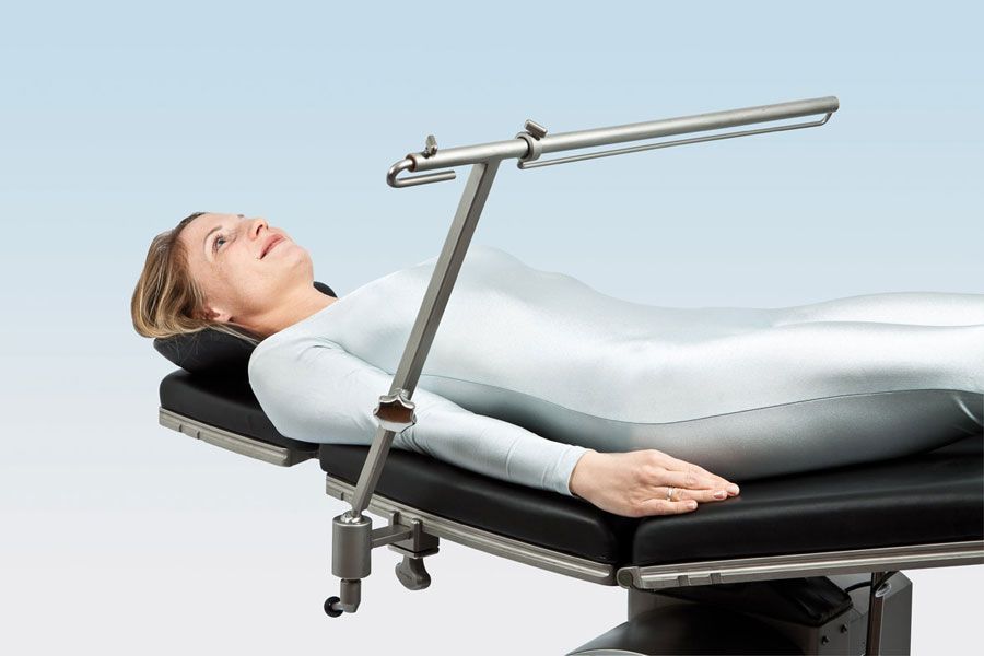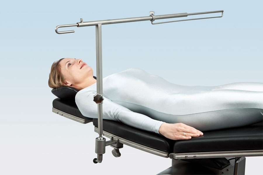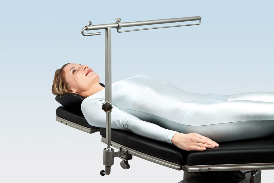 Функциональный держатель из нержавеющей стали для наиболее часто используемых в хирургии систем защитных покрытий. Длина и высота регулируется при помощи телескопической системы, наклон – при помощи шарового шарнира и последующего зажима. На крючке, при необходимости, возможно размещение флакона с инфузионным раствором.