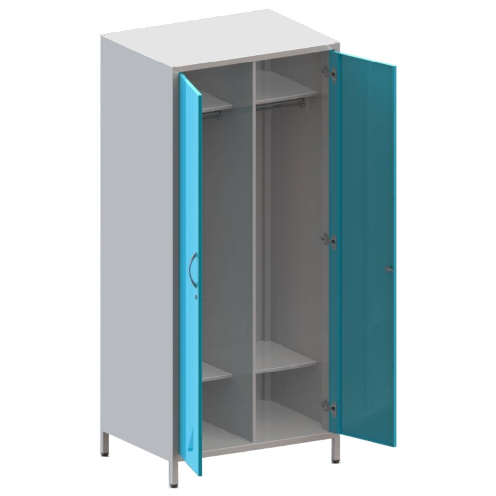 Шкаф двухстворчатый, цельносварной конструкции с замками на дверках. Внутри шкаф разделен вертикальной перегородкой на две секции. В каждой секции расположена полка для головных уборов, полка для сменной обуви, штанга под плечики.