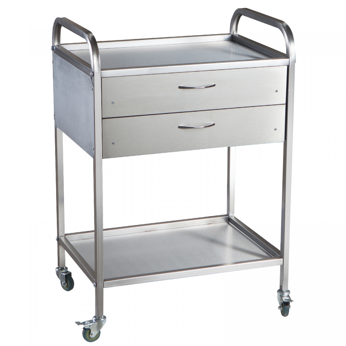 Каркас выполнен из профильной стальной трубы 20х20, стандартной для всех столиков модели «СМИ». Столик по умолчанию комплектуется пластиковыми колесами диаметром не менее 50мм*, два из которых с тормозом. Полки, по выбору заказчика могут быть изготовлены из стекла, металла или нержавеющей стали. Изделие поставляется в разобранном виде, что позволяет экономить средства при перевозке в другие регионы, однако, по желание заказчика, столик может поставляться и в собранном виде. Возможно изготовление полностью из нержавеющей стали. Для крепления ящиков применяются телескопические шариковые направляющие, ручки хромированы.