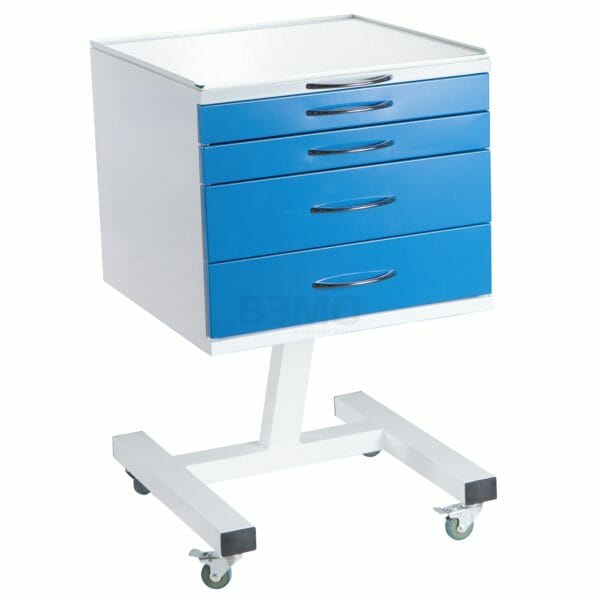 Передвижная тумба имеет четыре ящика на опоре, сверху полка из стекла. По желанию заказчика, так же в столике можно сделать три выдвижных ящика. Опора имеет четыре колеса серой резины Ø50 мм. Столик может использоваться отдельно, а так же отлично сочетаться с набором мебели.